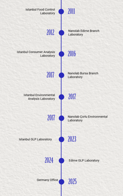 Nanolab Laboratory Group was established in Istanbul in 2011 and has become one of the leading test and analysis centers in the industry with its science and technology-based service approach. Operating in accordance with international standards, Nanolab offers reliable, accurate, and fast solutions to its customers with its TÜRKAK accredited laboratories. Embracing the principles of quality and trust since its establishment, our company provides a wide range of testing and analysis services with its expert staff and advanced technological infrastructure.